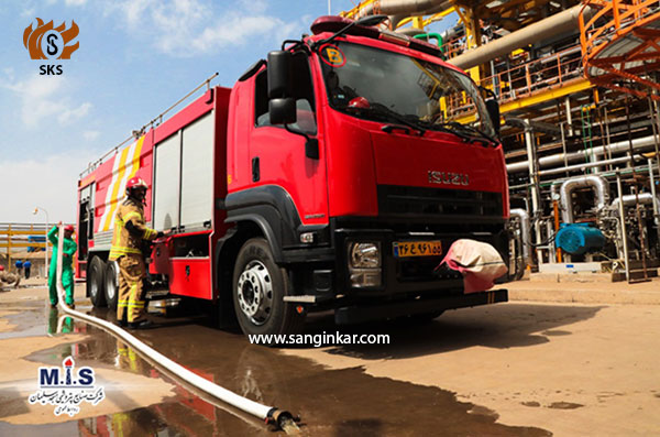 استفاده از خودروهای آتش نشانی ساخت شرکت مهندسی سنگین کار صنعت در مانور شرکت صنایع پتروشیمی مسجد سلیمان