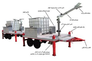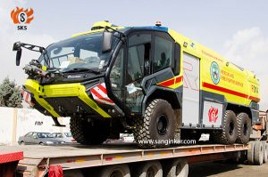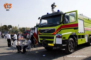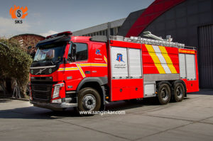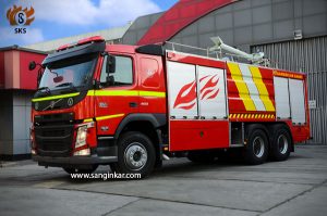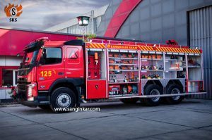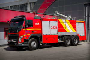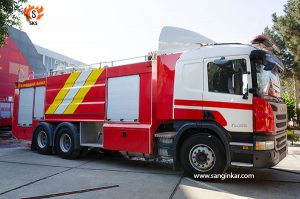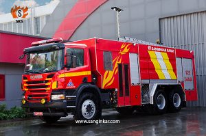 The Scania refinery fire truck has a cockpit and telescopic spotlight